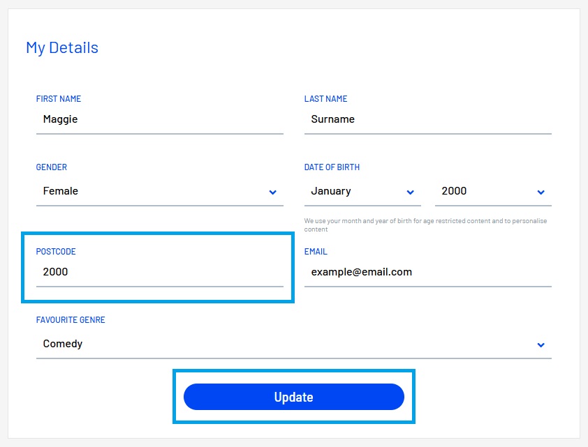 2. Make sure you're in the 'Accounts' tab, enter your postcode (please ensure this is accurate, as the state will be assigned based on the postcode used), and click 'Update'.